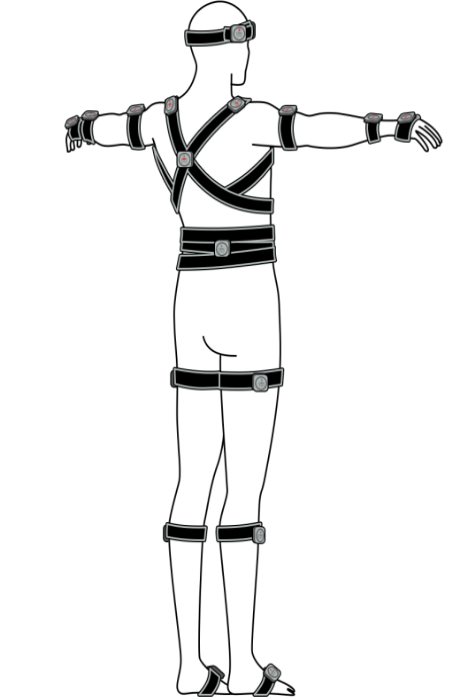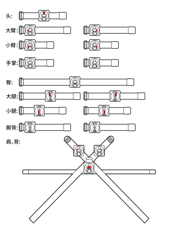 根据每条绑带的佩戴部位提示将绑带依次佩戴在如下图所示的对应位置。因为恒卓传感器测量的是骨骼的运动,所以需要尽可能的排除肌肉运动带来的物理干扰。穿戴位置需要选择肌肉量最少的位置,这样捕捉的数据效果较好。后面进行的姿态校准会重新计算穿戴位置,所以即使您佩戴的位置和图片上有少许误差,也是可以的。