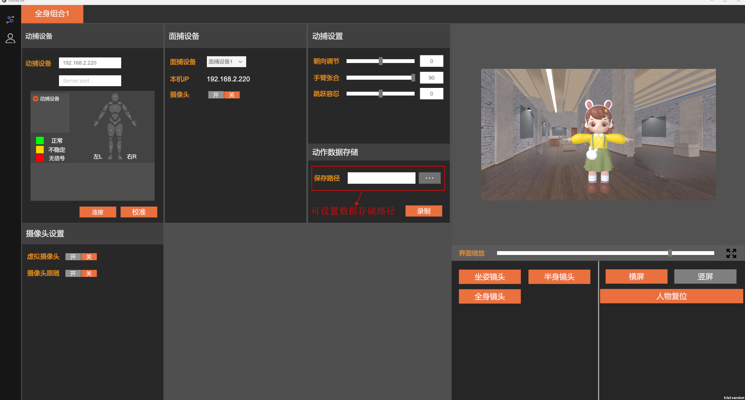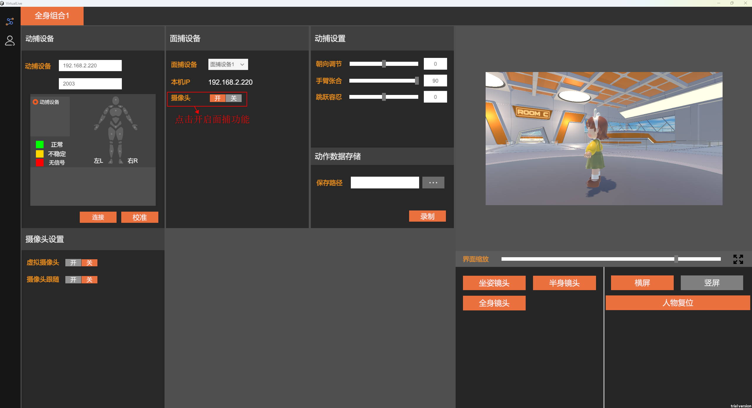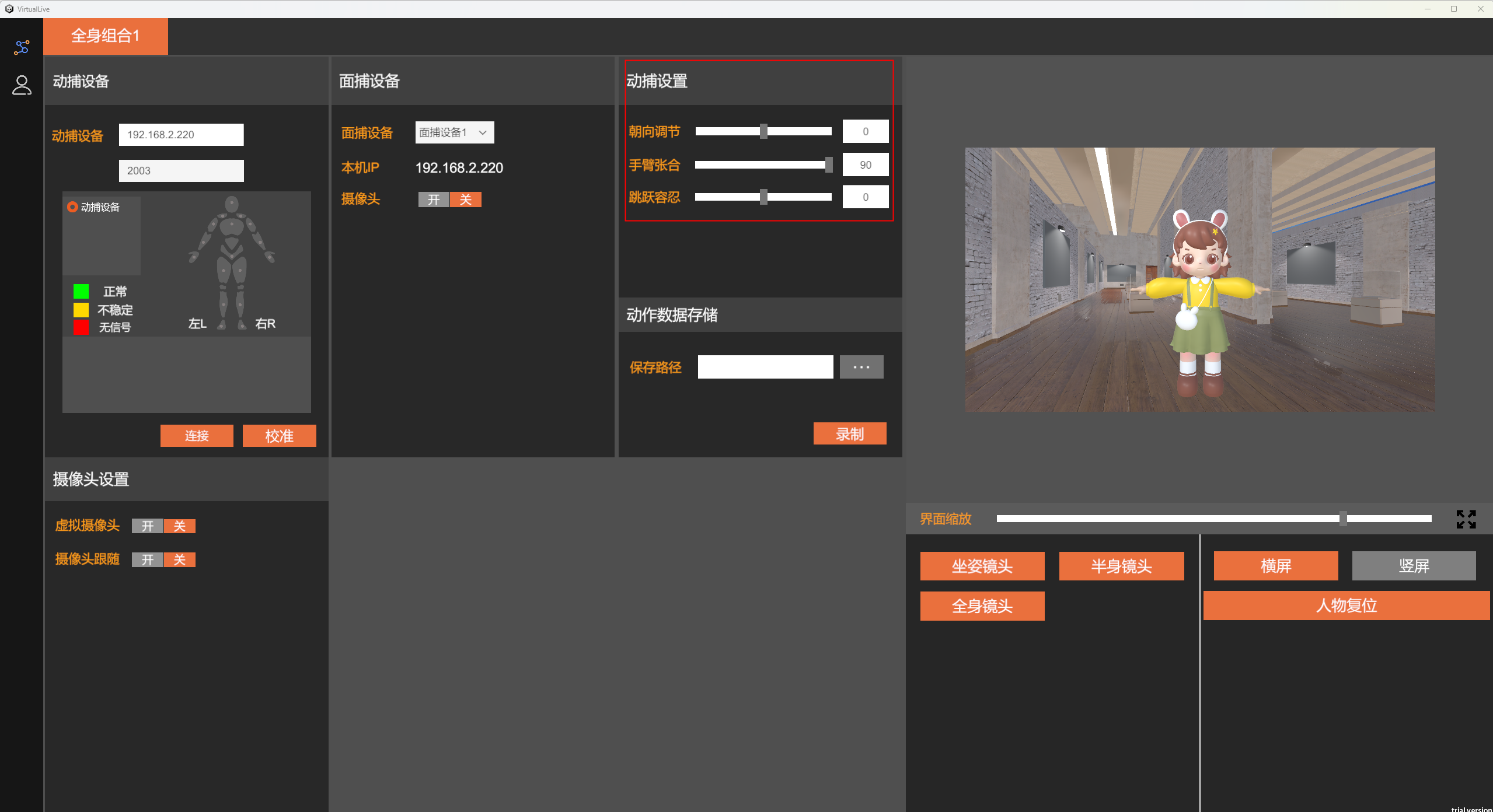 软件中支持动捕设置,包括手臂张合、朝向调节、跳跃容忍
