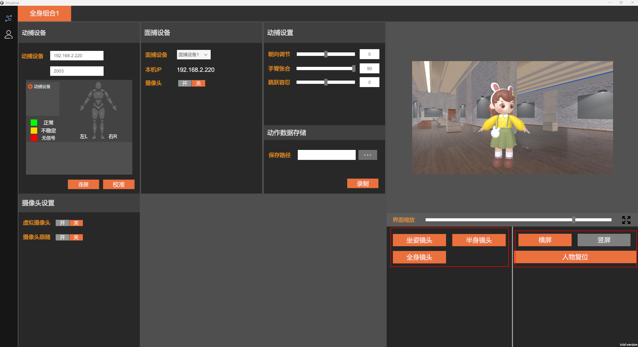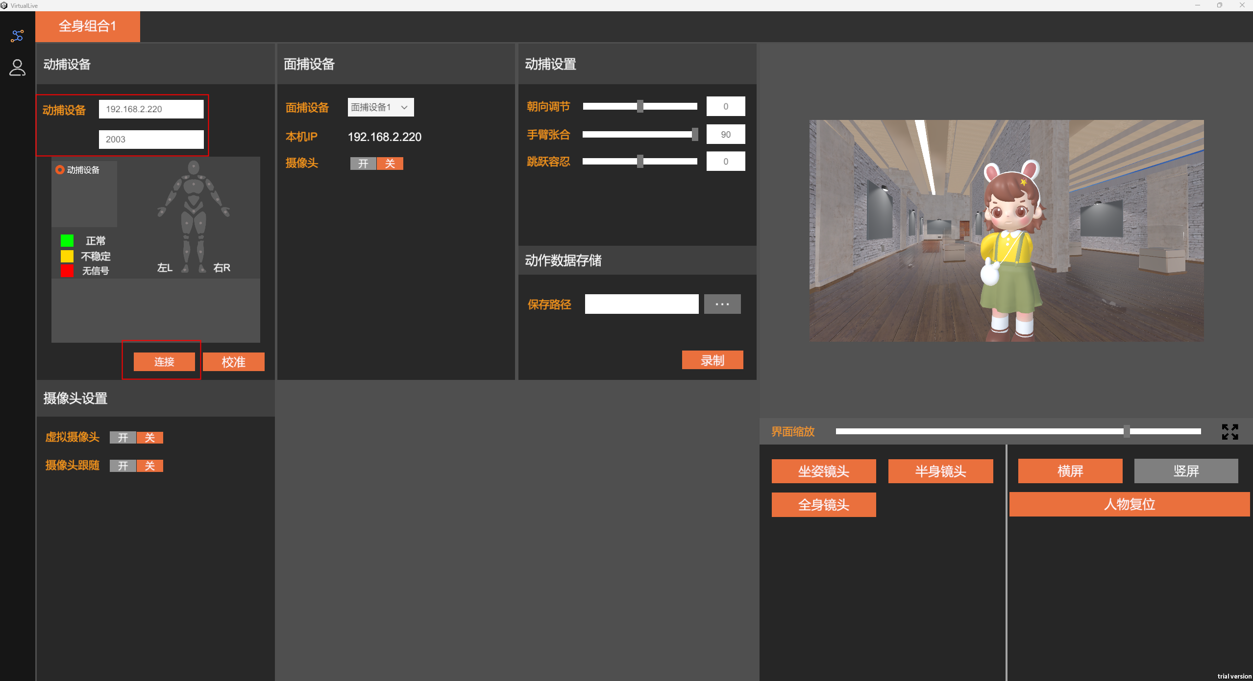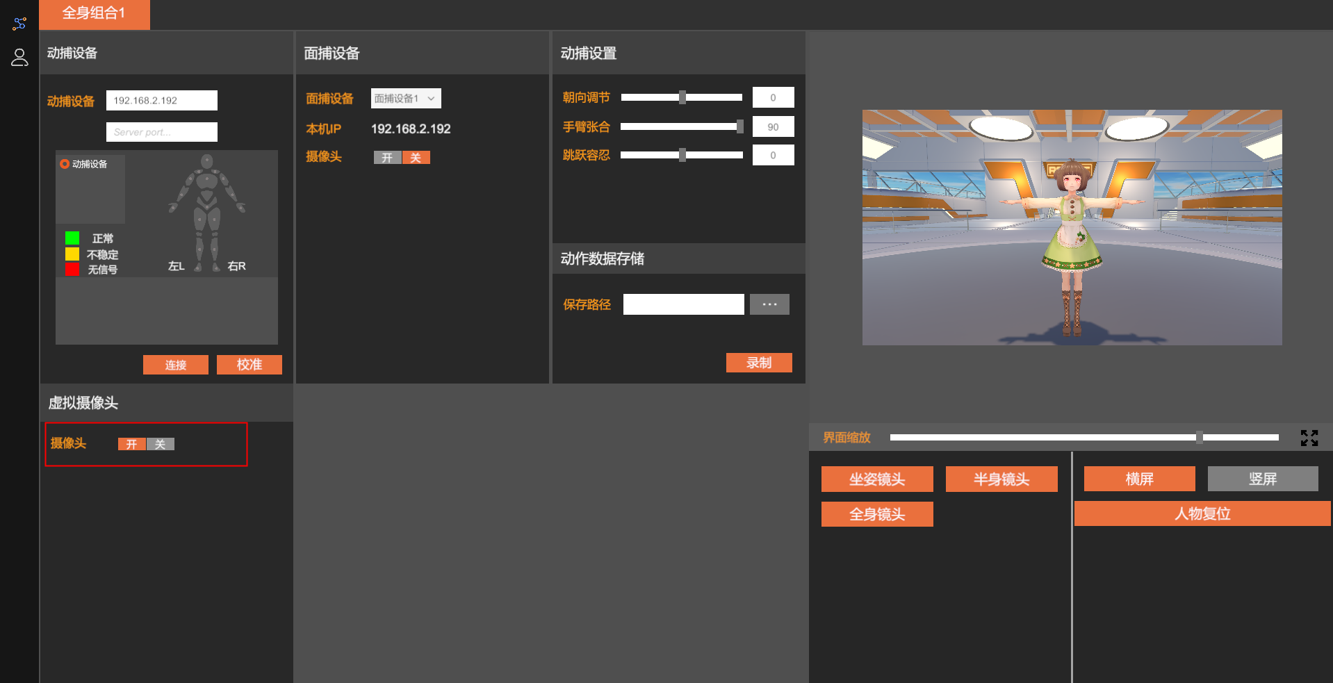 软件中支持动捕设置,包括手臂张合、朝向调节、跳跃容忍
