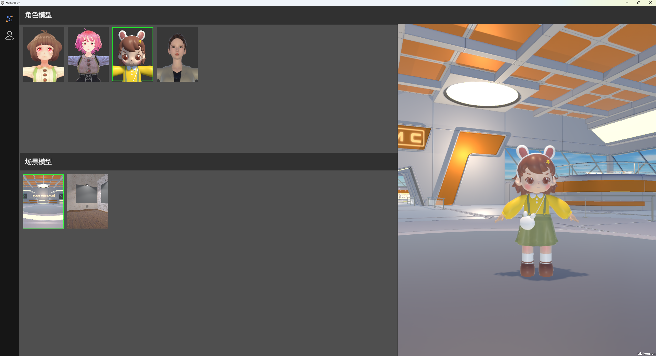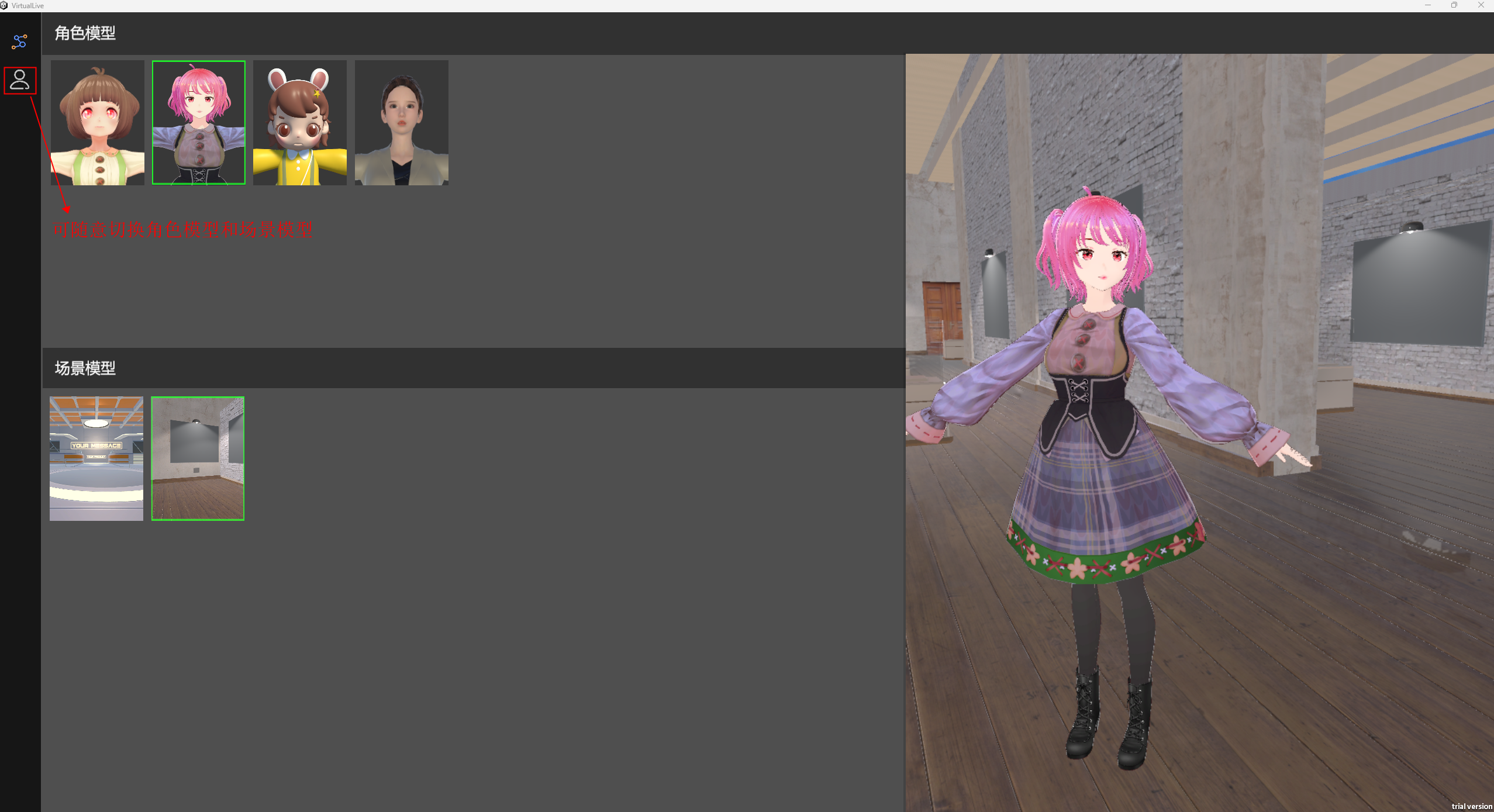 软件中用户还可以随意切换人物角色和场景模型,共包含4种不同风格人物模型和2个场景