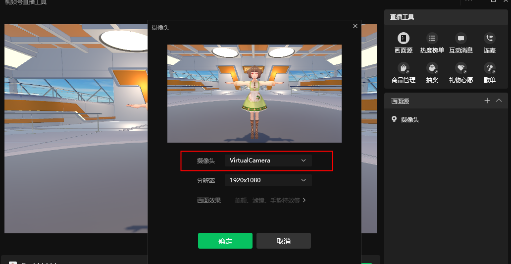 视频号直播助手中选择添加画面源,选择"摄像头",摄像头选择名字为\"VirtualCamera\"的摄像头,分辨率为1920*1080,然后确定。