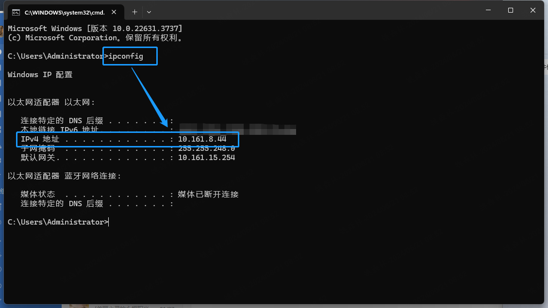 查看IP方式:WIN + R键唤出 运行窗,并输入cmd,再点击确定,在CMD窗口中输入ipconfig并按下回车,找到IPv4地址,该地址为电脑的的局域网地址
