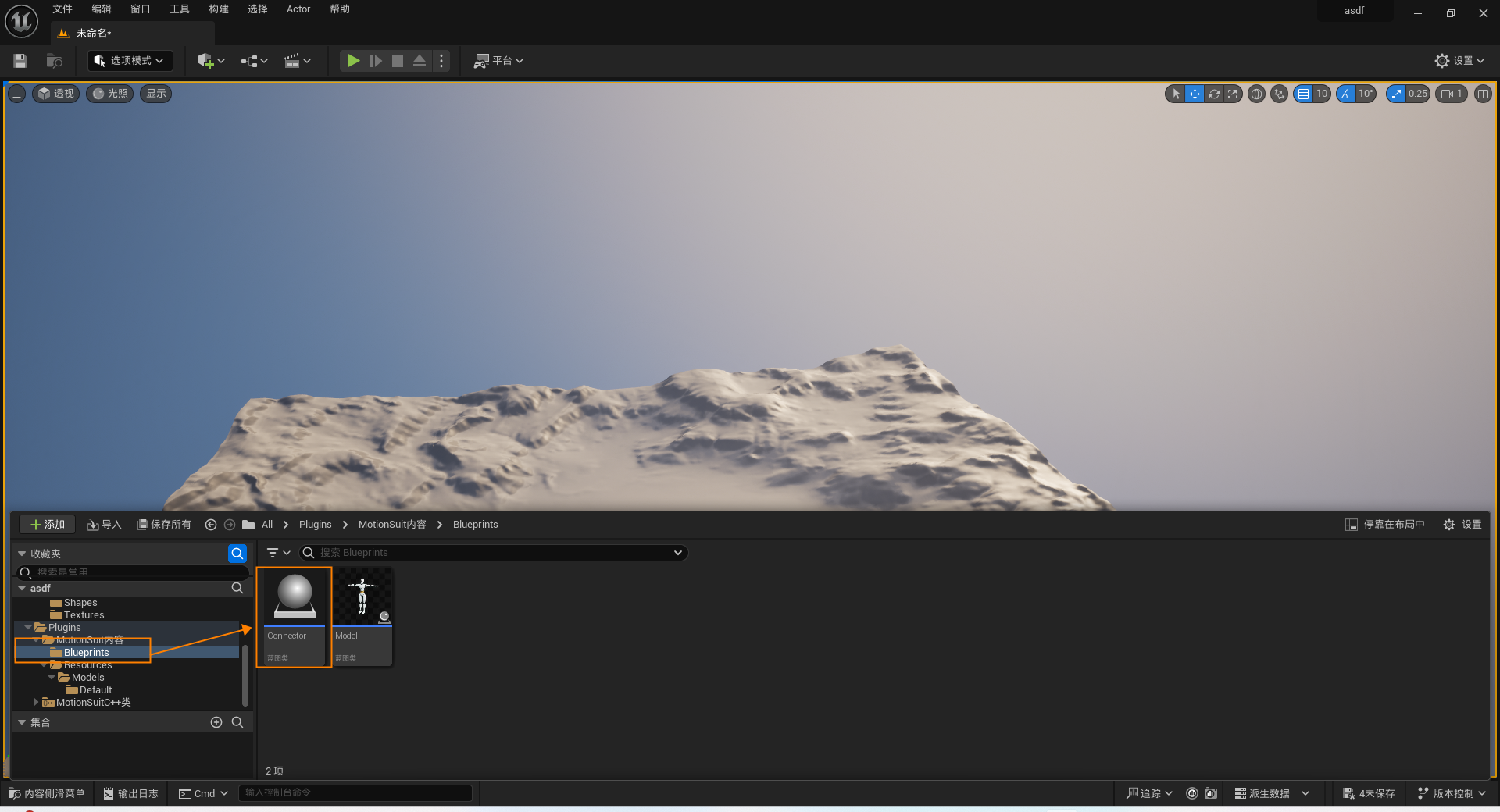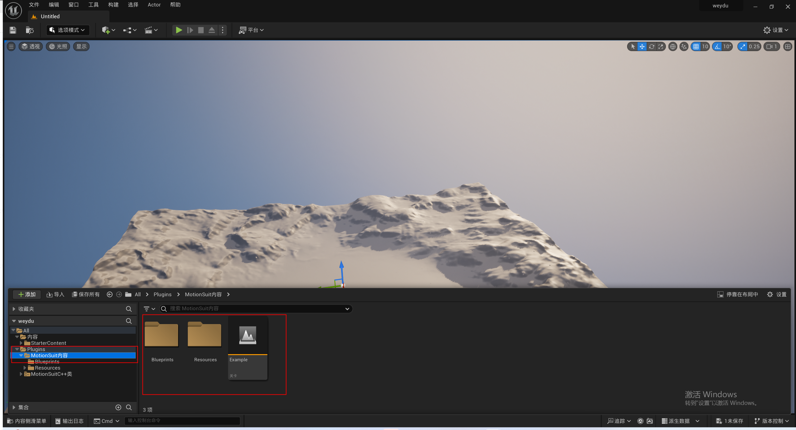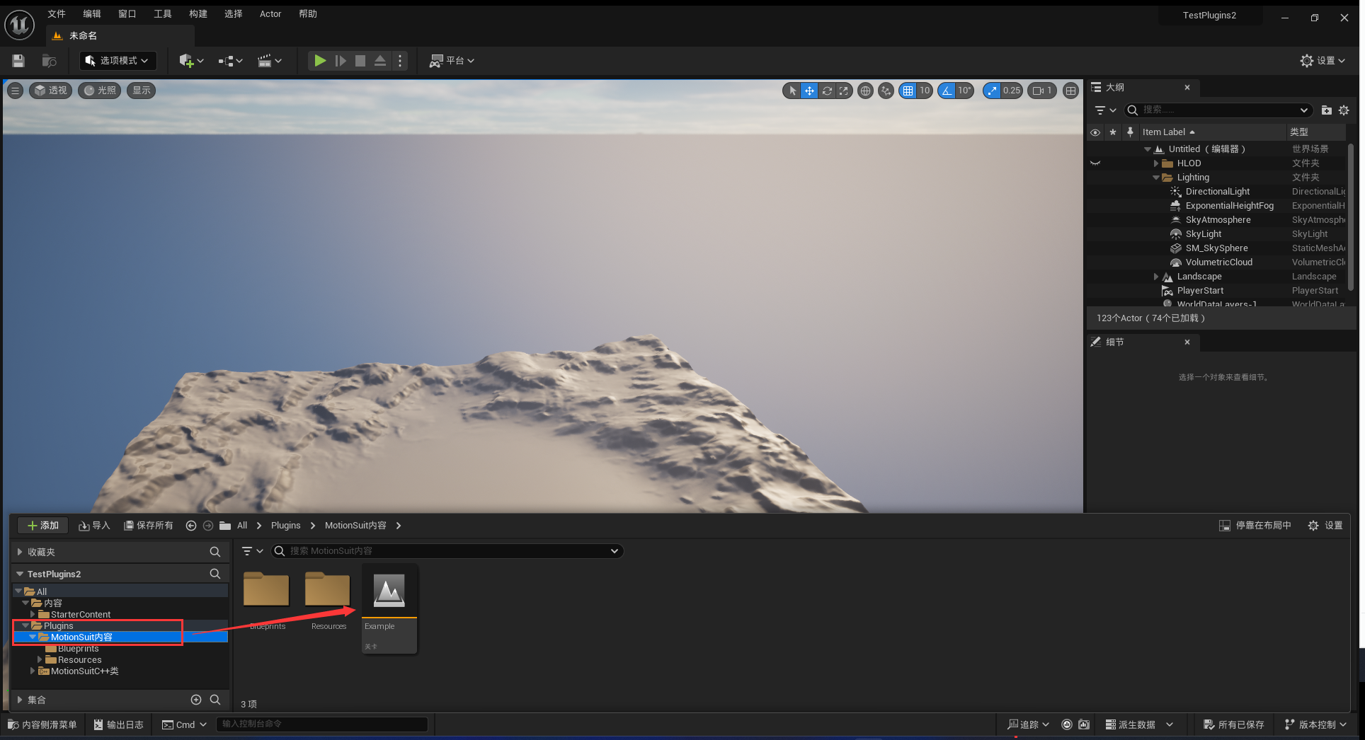 1.点击内容测滑菜单,找到Plugins-MotionSuit内容,双击打开Example