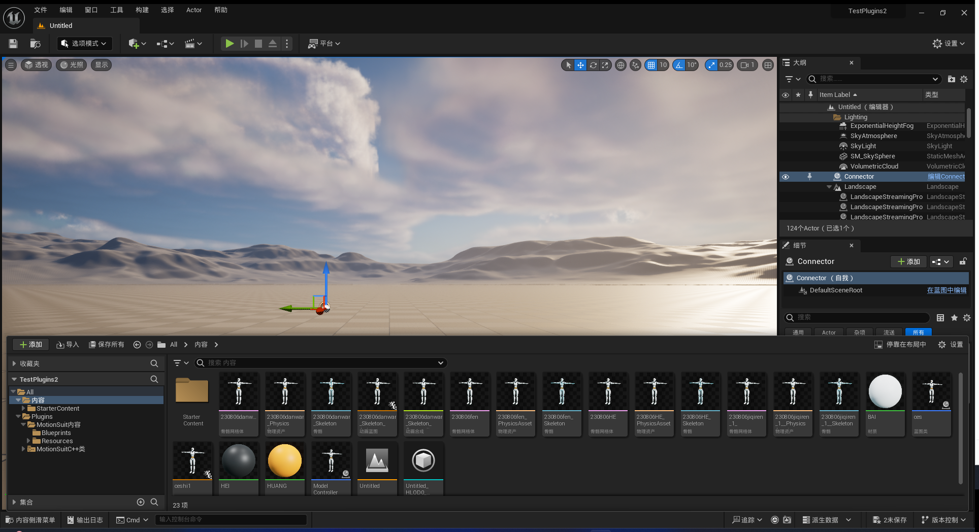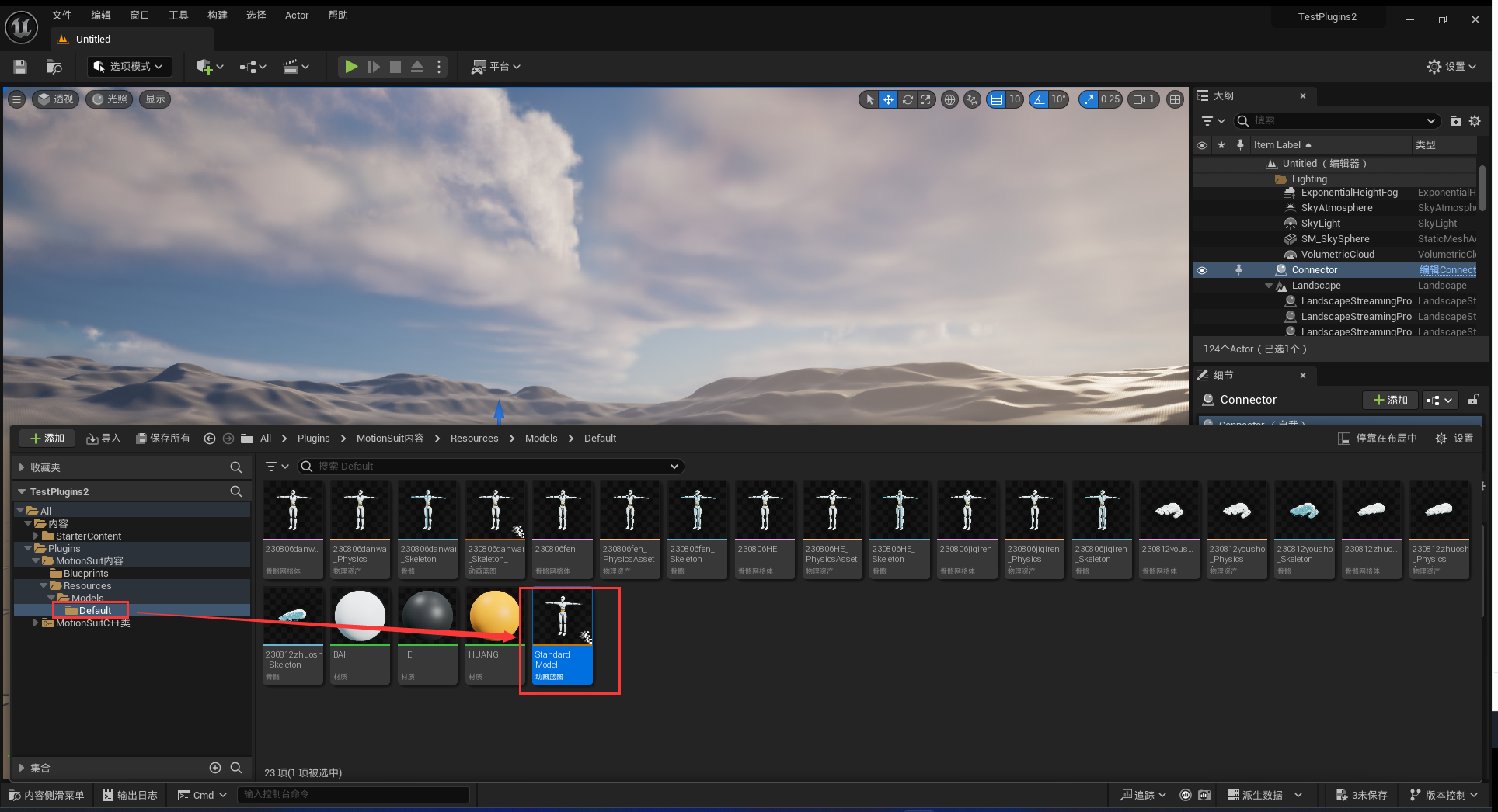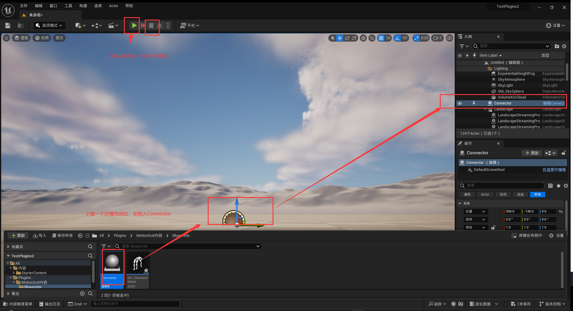 拖入前最好点先点一下运行和停止(不然后面会看不到模型),设置完毕后的 Connector 拖入场景中(确保场景中存在该Actor)