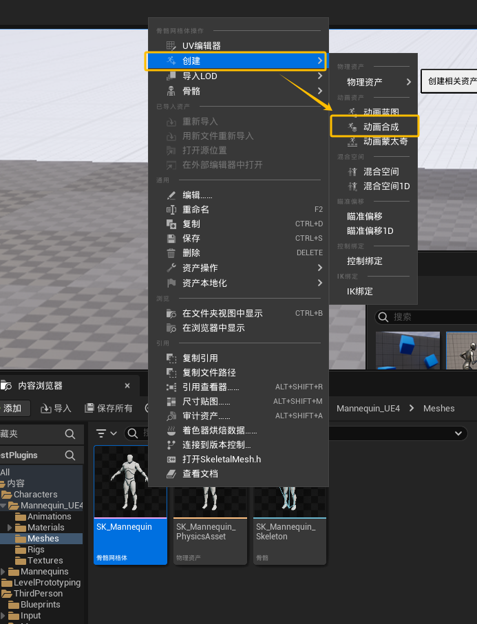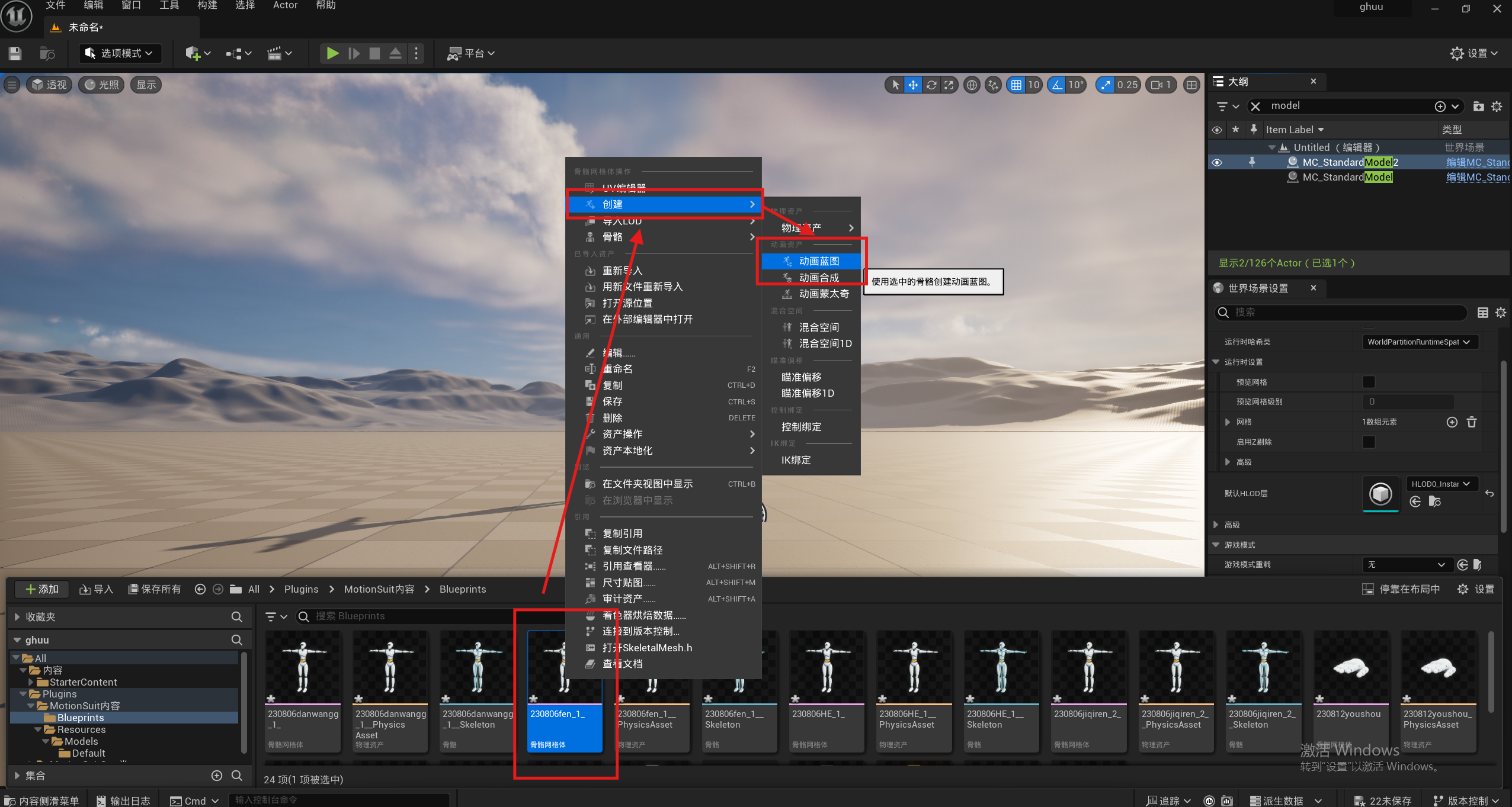 3.选择骨骼模型点击鼠标右键,点击创建---动画蓝图