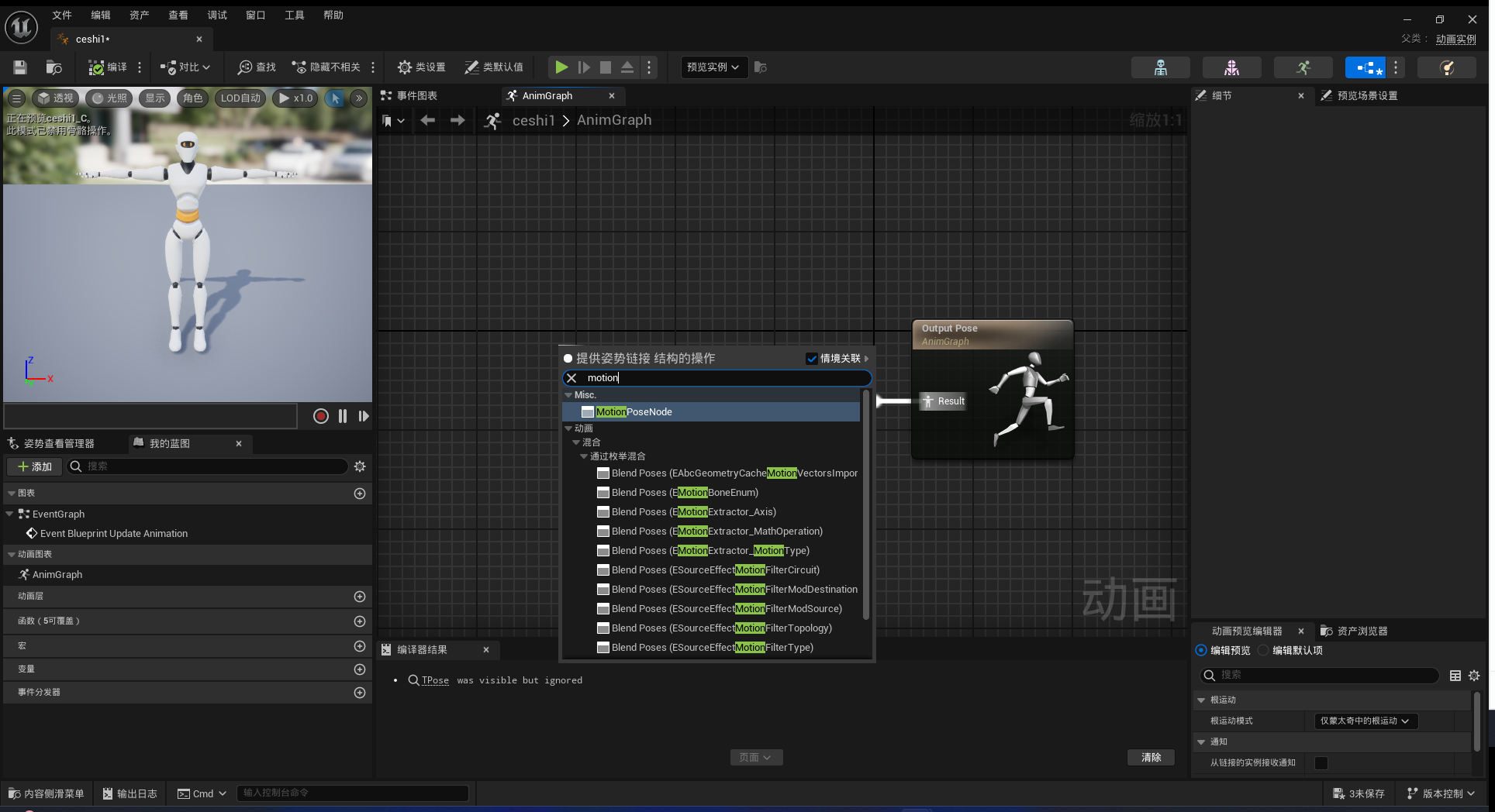 创建后双击打开动画蓝图,点击Result引脚拖长,输入MotionPoseNod