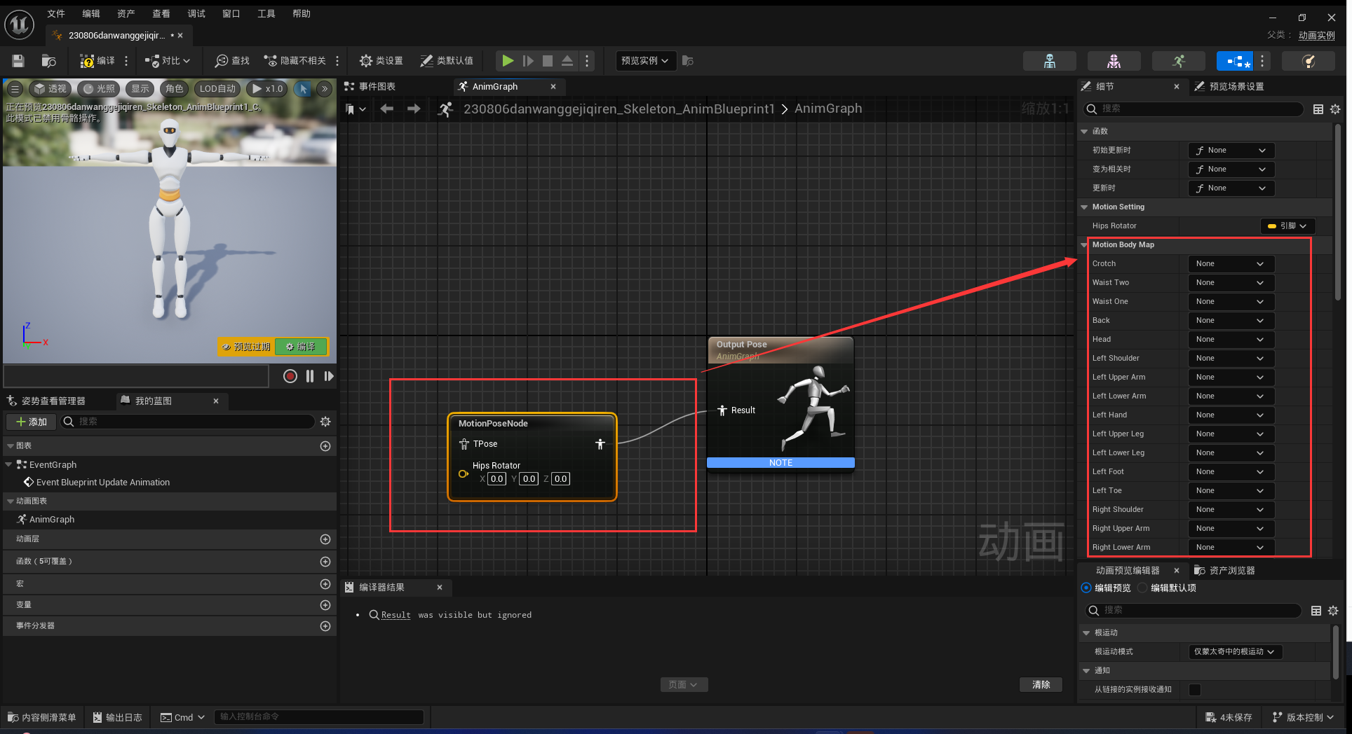 MotionPoseNod框和Result框相连接后,点击MotionPoseNod框,可配置右侧细节框中配置骨骼对应关系