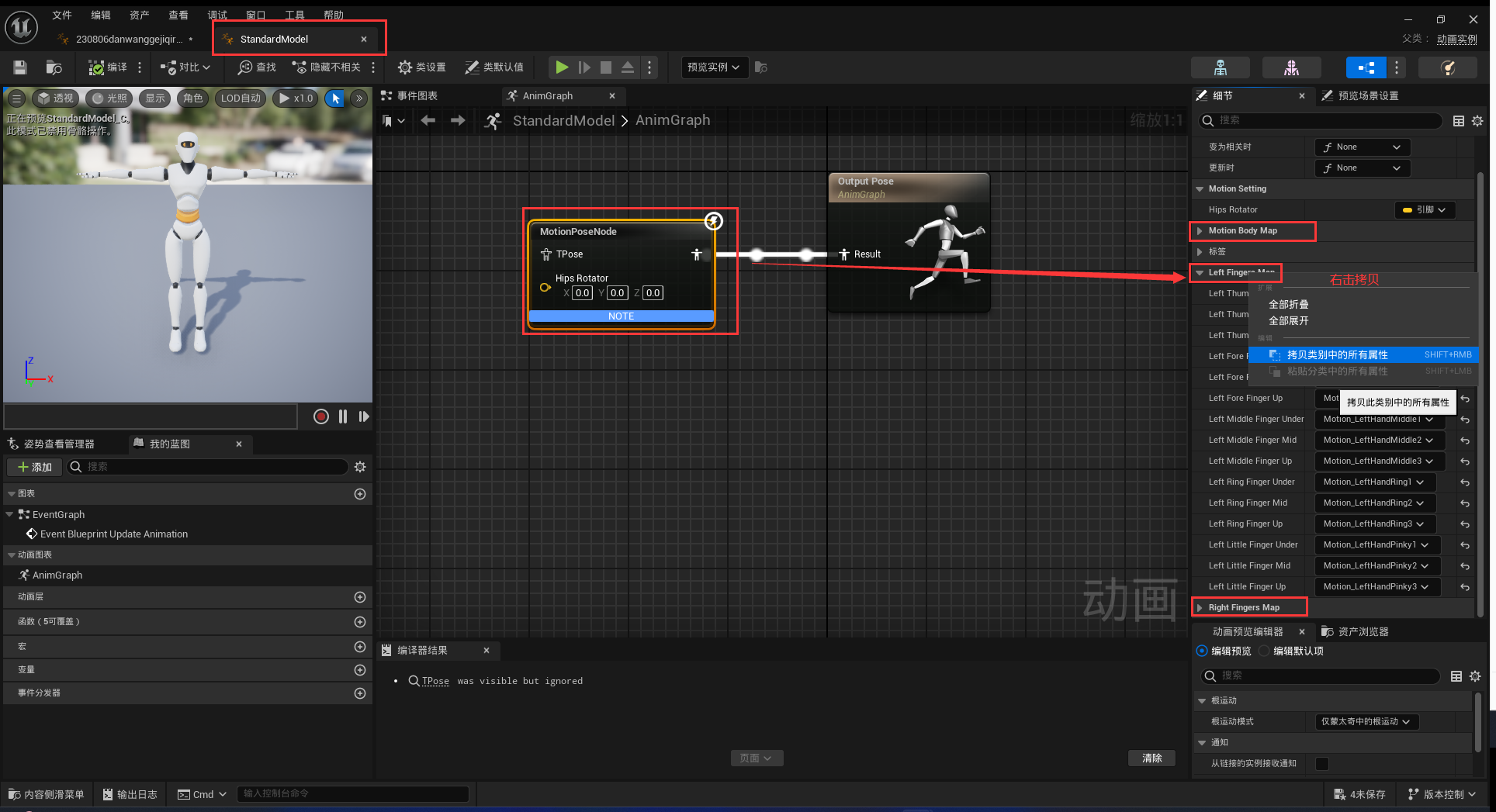 打开动作蓝图,选中MotionPoseNod框,需拷贝Motion Body Map、Left Fingers MAP、Right Fingers MAP数据。