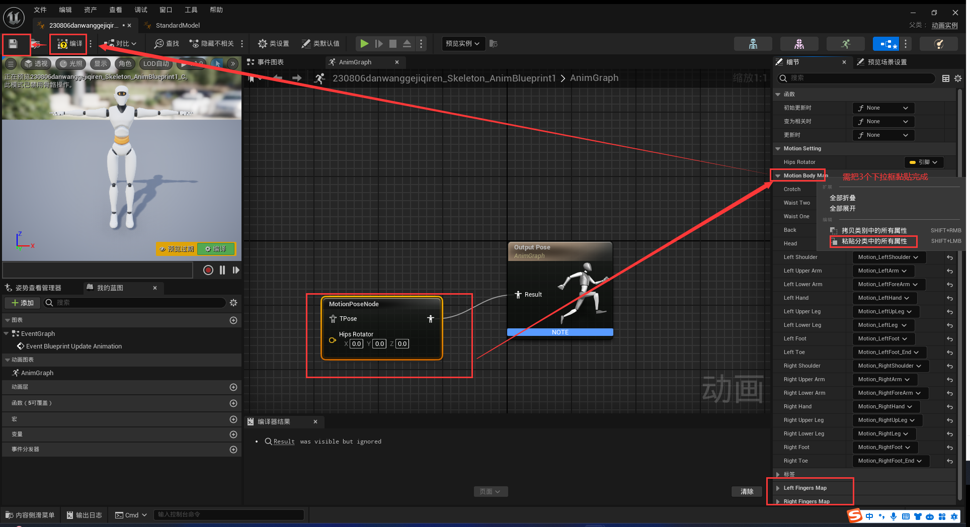 将新建的T-Pose动画拖入动画蓝图中,并将该动画的输出引脚与MotionPoseNode的TPose引脚相连并点击编译和保存