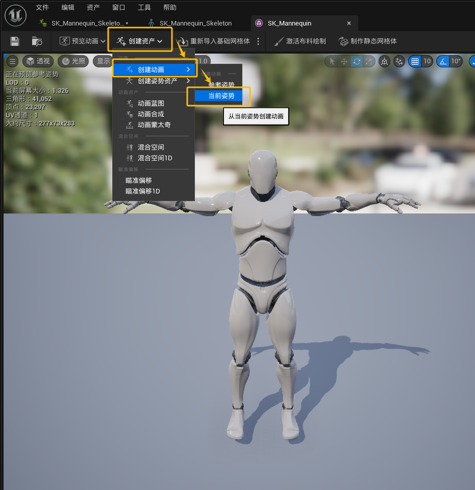 在上方工具栏中点击创建资源->创建动画->当前姿势,将TPose保存为动画