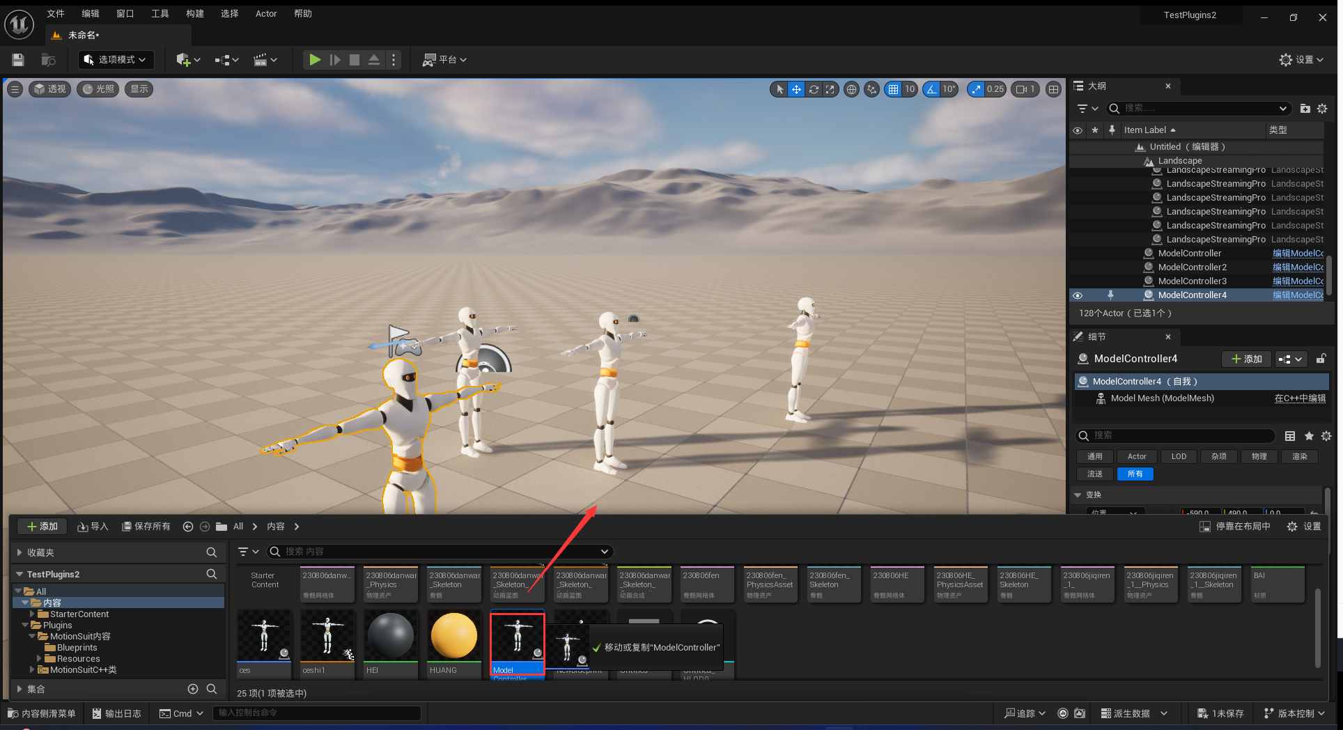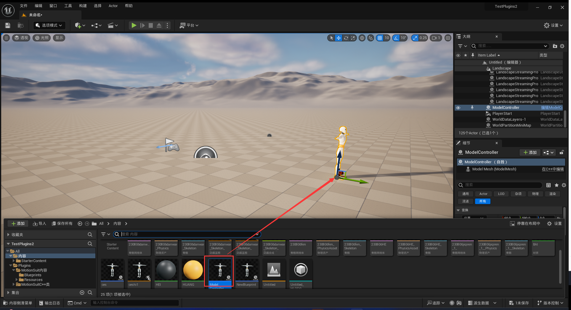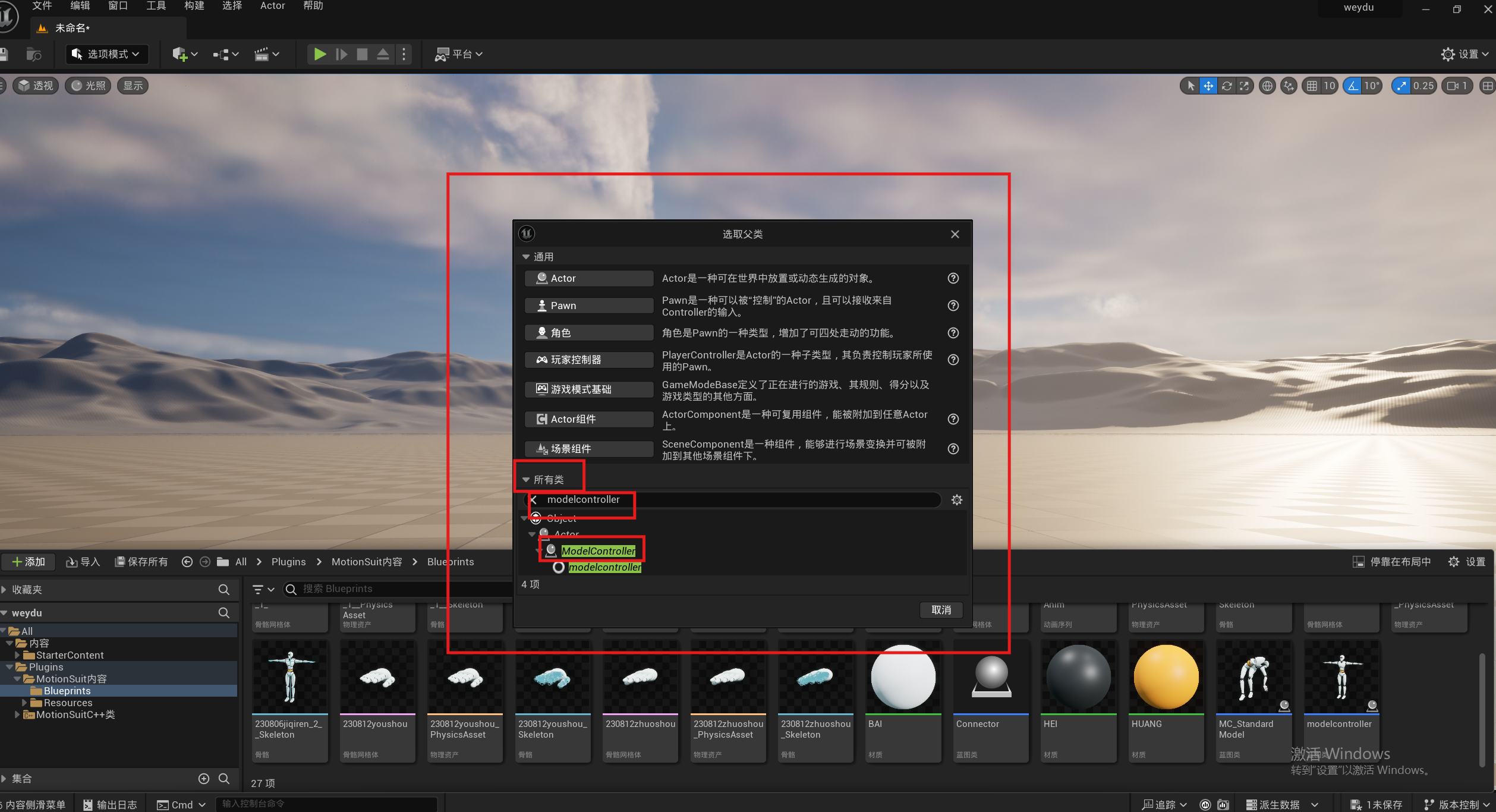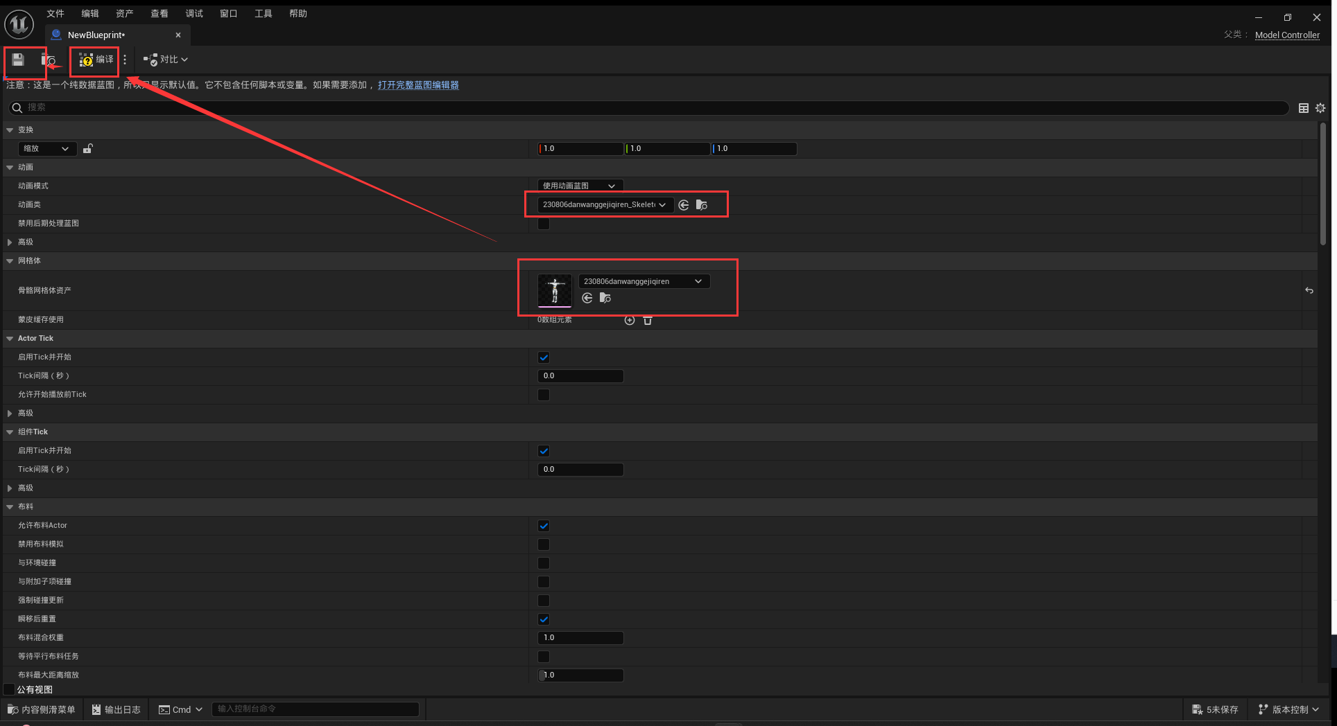 5.新建ModelController蓝图,并在蓝图中的在SkeletalMesh中设置模型的蒙皮以及动画蓝图(第三布中创建的动画蓝图),将该ModelController拖入场景中