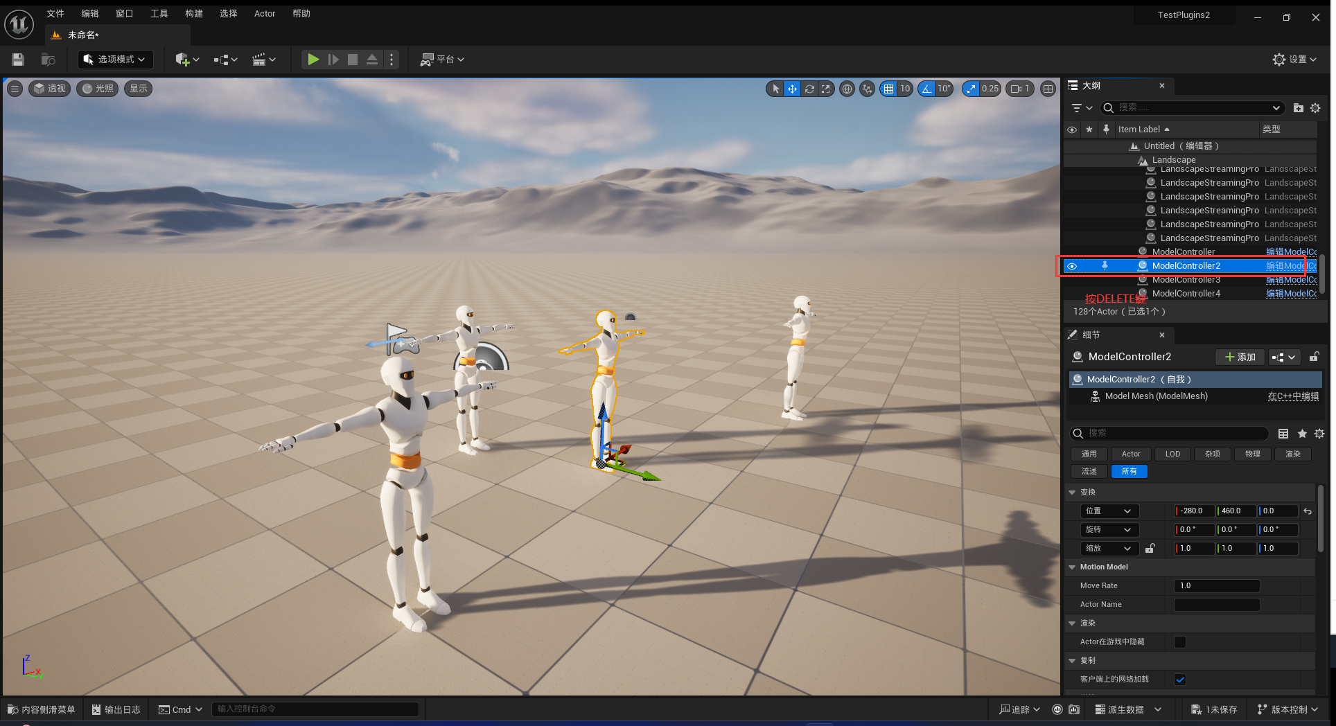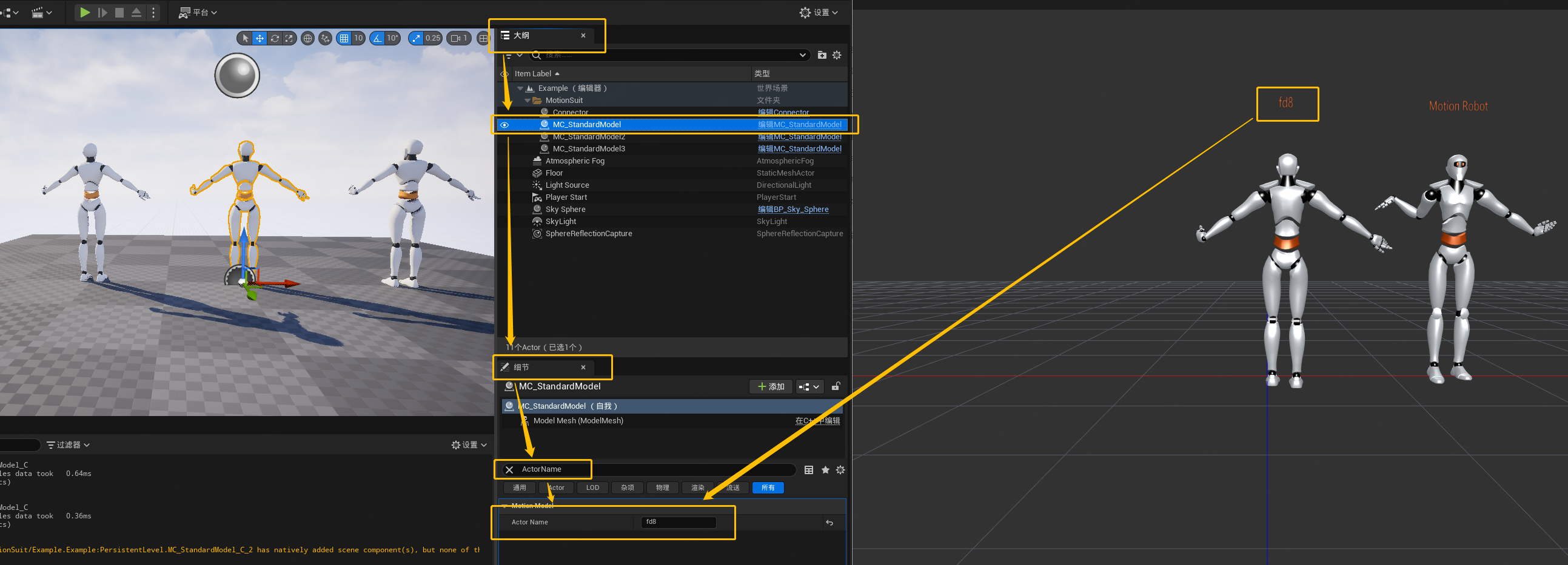 7.设置角色名字,在细节窗口中搜索并修改ActorName属性,填入MS中角色头顶的角色名;运行时ModelController会根据ActorName获取对应设备的动作数据