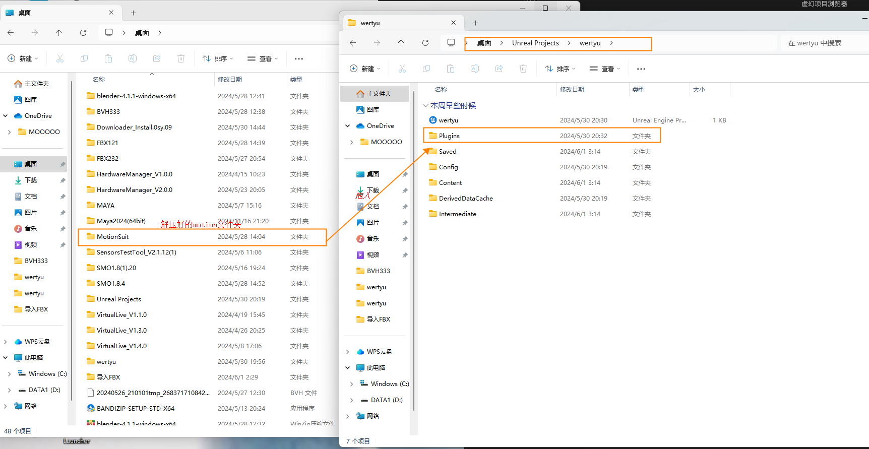 4.创建项目后找到项目文件夹,在项目文件夹中新建Plugins文件夹,将解压好的motion文件