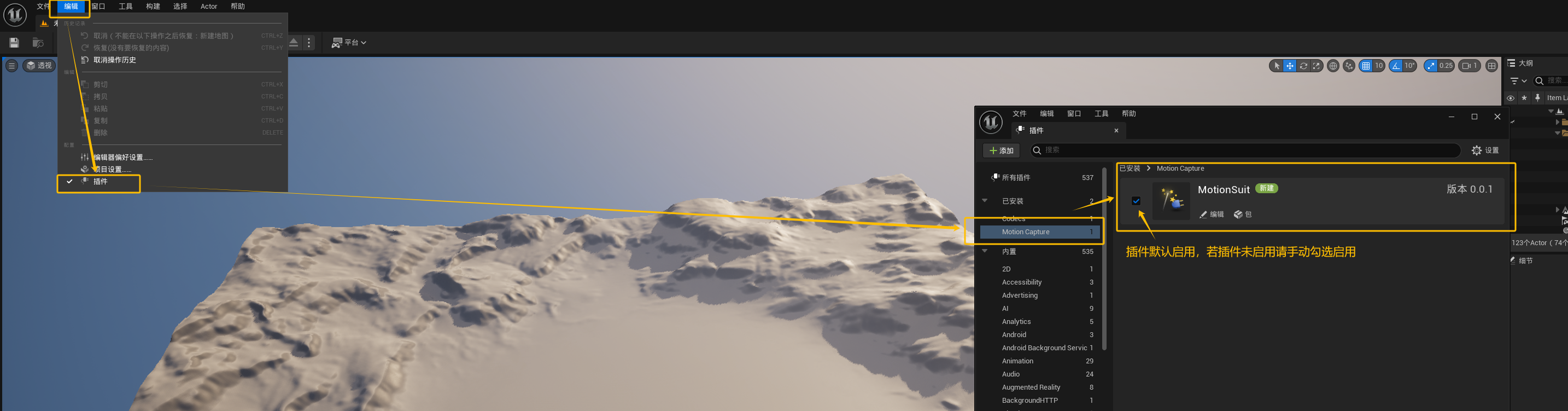 5.重新启动UE引擎,在编辑---插件中可以看到插件是否已经启用,若未启用请勾选启用