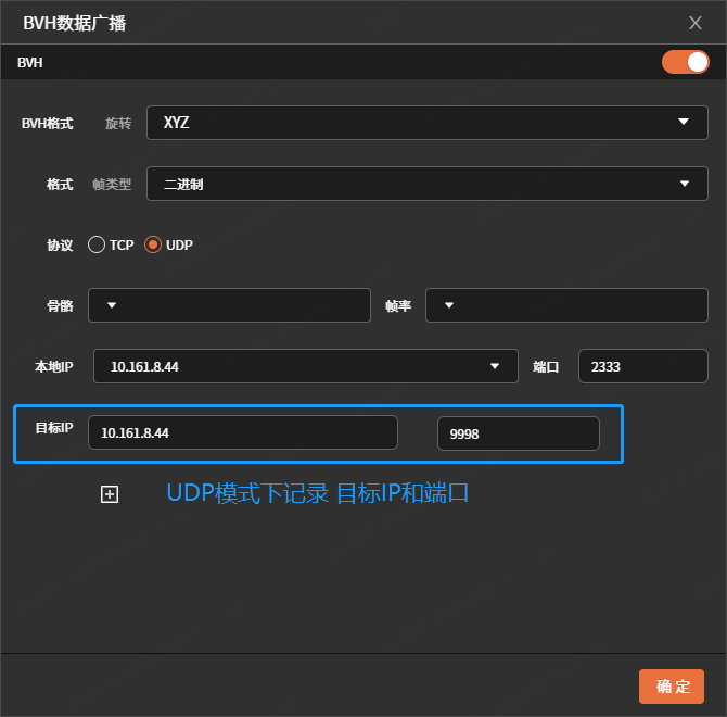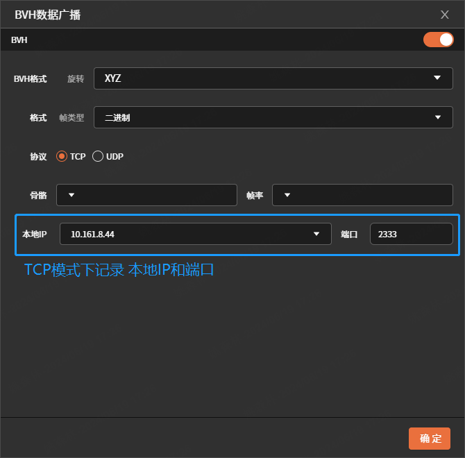 开启MotionStudio软件的数据广播,设置并记录串流端口、传输协议、旋转数据类型