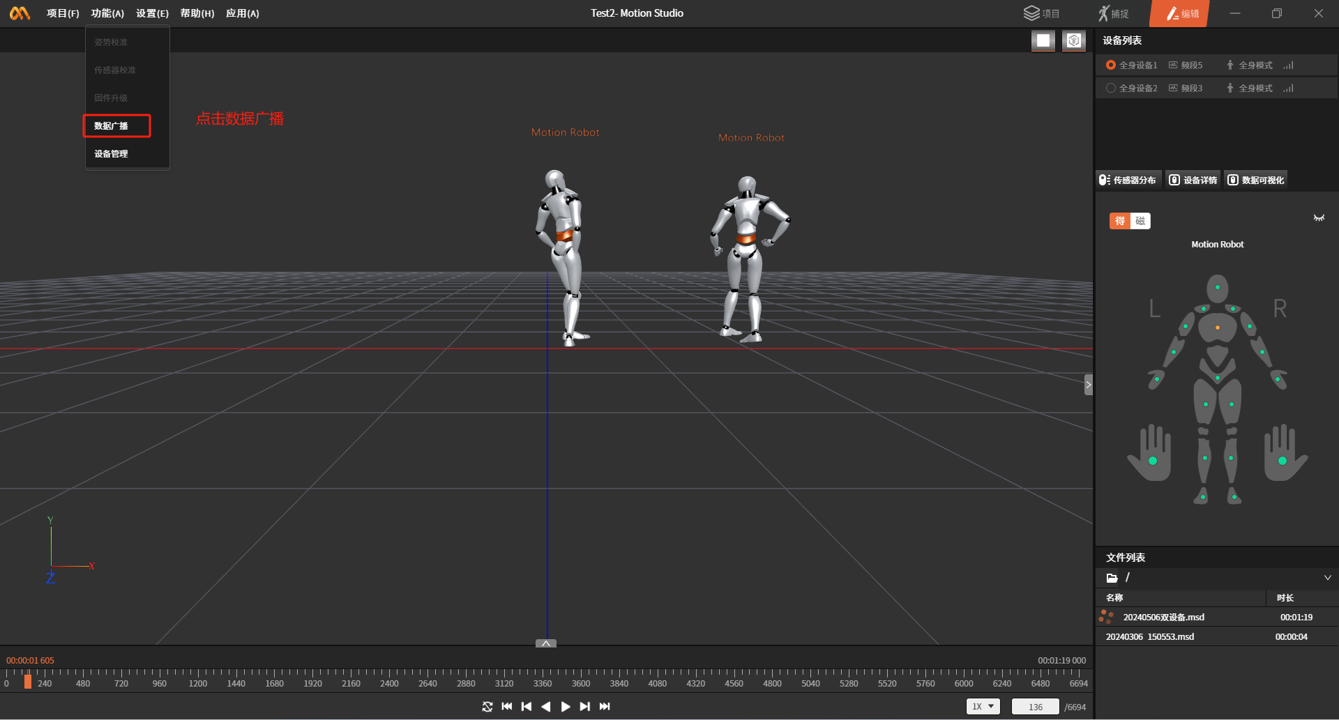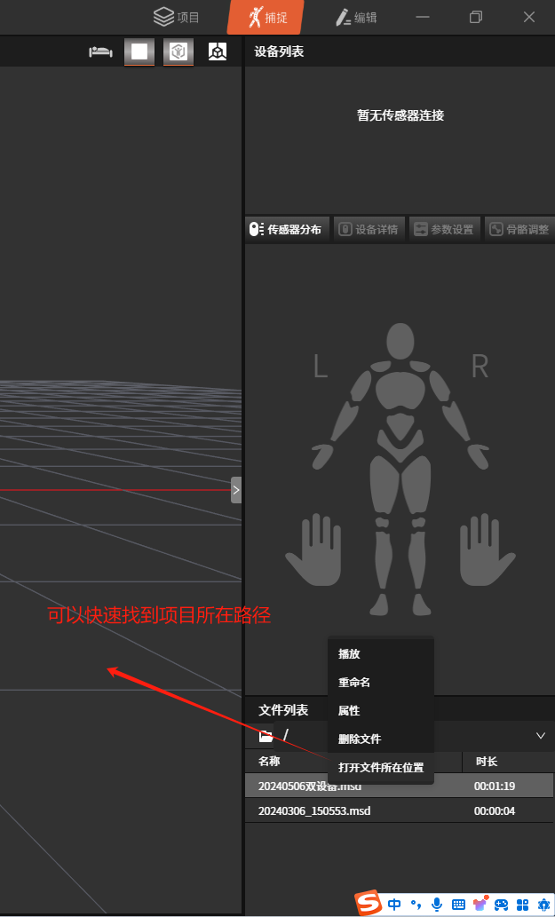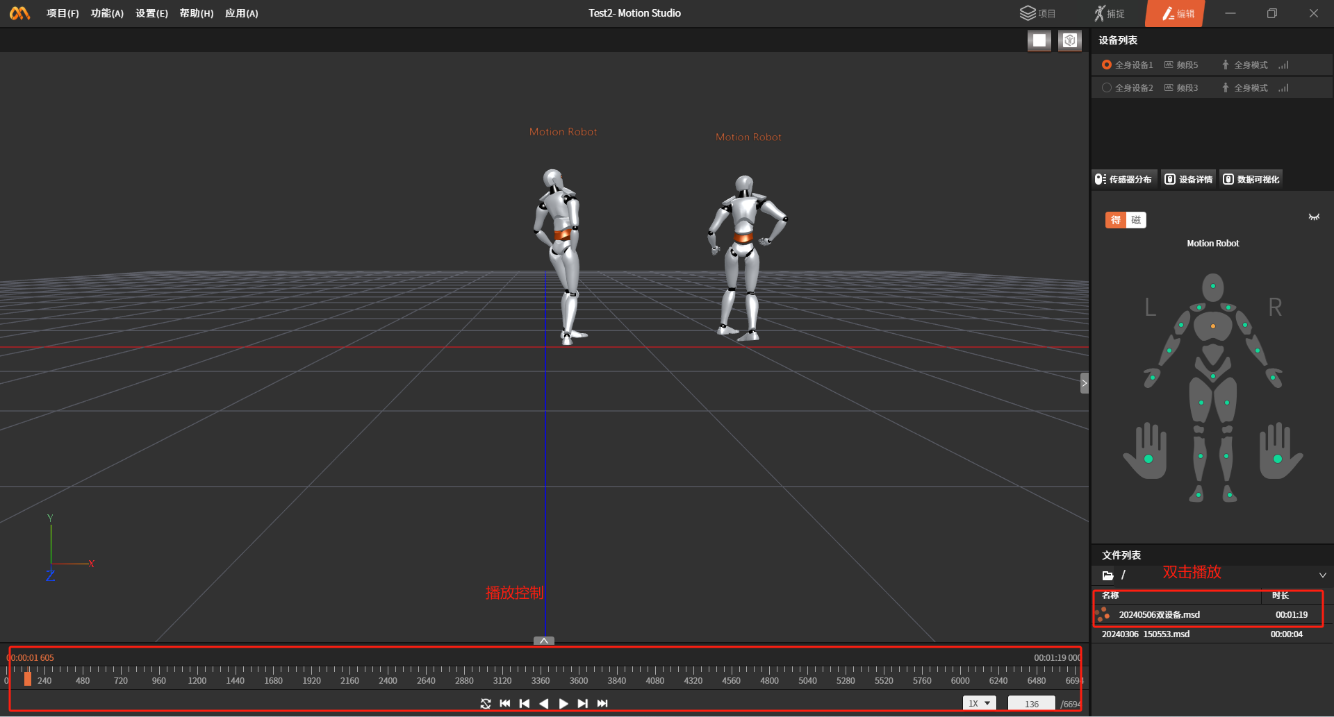 如果以上配置正确会在文件列表中看到\"20240506双设备.msd\"文件。双击文件就可播放录制的动捕数据。